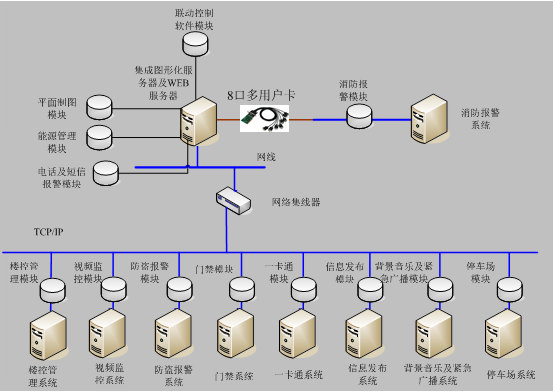 綜合布線、安防(視(shì)頻(pín)監控、防盜報(bào)警)、一(yī)卡通(βδ★≈tōng)(門(mén)禁、停車(chē♠σ)場(chǎng)、消費(fèi)、梯控)、巡更系統、背景音(yīn)樂 £(yuè)、機(jī)房(fáng)建設、信息發布、樓宇自(zì)控≥、樓宇系統集成等系統組成。