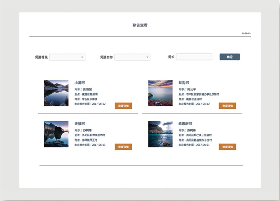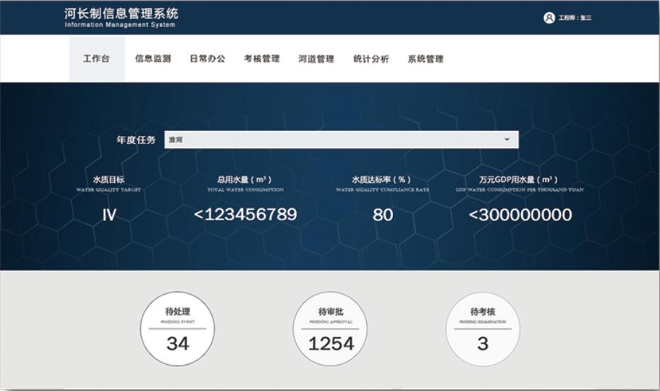 展示總河(hé)長(c±•háng)、河(hé)長(cháng)等角色最關心的(de)信息。包括上(sh→ε"♦àng)級下(xià)發的(de)任務及任務完成情況、公衆舉'≈報(bào)信息及處理(lǐ)情況、河(hé)長(cháng)考核λ↑§結果、水(shuǐ)質監測及評價結果、用(yòng)水(shuǐ)總量統計(jì)信息、河(h€↕φé)道(dào)整治成果展示。